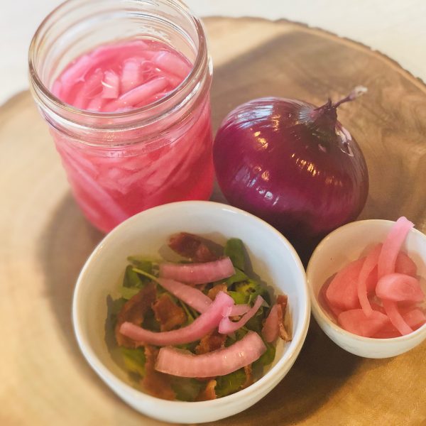 Depending on the size of your family you might want to double the recipe. Jonathan and I only use 1 – 12 oz jar each week. The onions are good in the fridge for about 7-10 days. If they begin to discolor or turn brown toss them out. Fair warning, your jar will start to smell like onions. When you are ready for a new batch, wash the same jar and continue to reuse it for onions only. This will keep your whole collection of mason jars from smelling like onions, saving you from even more onion regret!